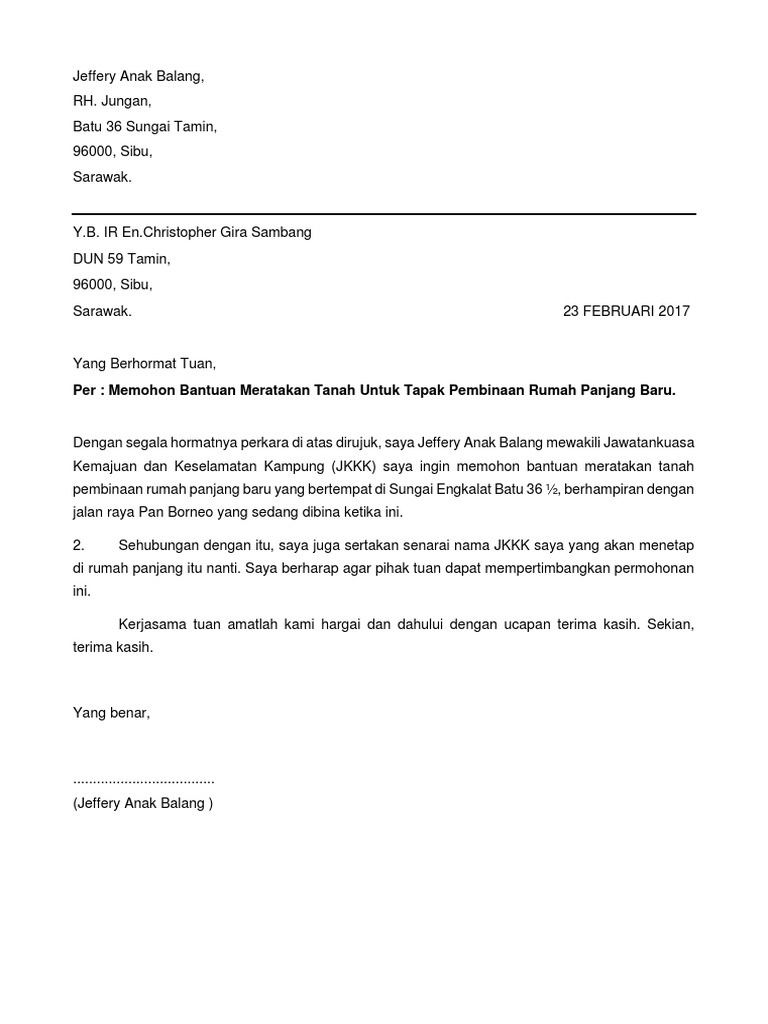 Contoh Surat Memohon Bantuan Membina Rumah Panjang